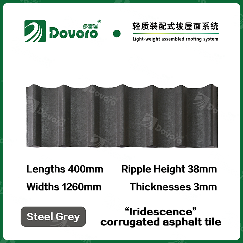 Dovoro “Mirage” corrugated asphalt tile is made of mineral plant fibers soaked in asphalt. The one-time formed base plate is impregnated in asphalt at high temperatures, making the tile more solid as a whole; The thermosetting resin ensures strength and stiffness of tile; Imported raw materials, in combination with advanced coloring technology, ensure long-lasting color, and the mixed color spraying process makes the tile elegant in appearance, beautiful in colors, and stereoscopic in texture.