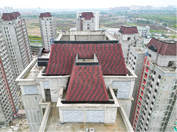 本項(xiàng)目位于天津市津南區(qū)北閘口示范鎮(zhèn),建筑面積30.82萬平方米,實(shí)現(xiàn)1429戶居民的“安居夢(mèng)”。在本項(xiàng)目中,多富瑞波形瀝青瓦作為裝飾性材料,為建筑屋面增添獨(dú)特魅力。