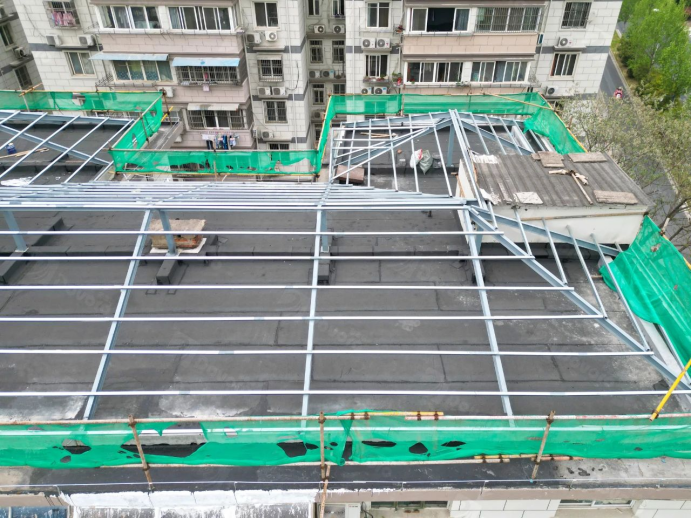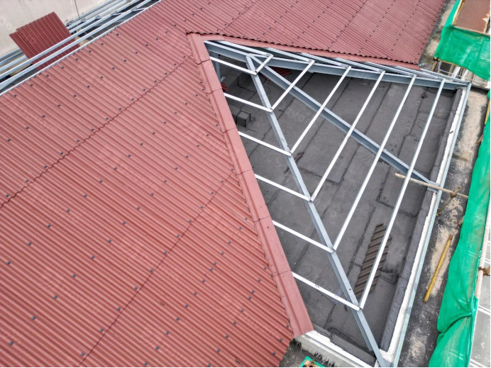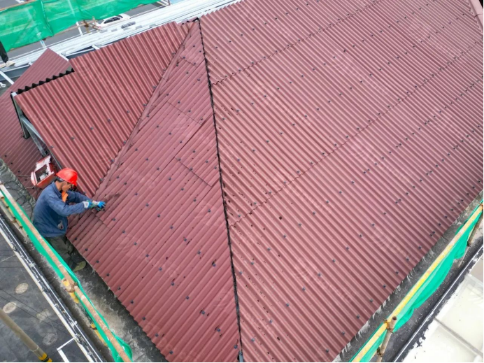 “無錫月秀東園項目”采用單層波形瀝青瓦的施工方案,將原先的平頂屋面清理后涂刷防水涂層,在平頂屋面上搭建坡屋面鋼構(gòu),使用瓦釘將波形瀝青瓦固定至鋼檁條。