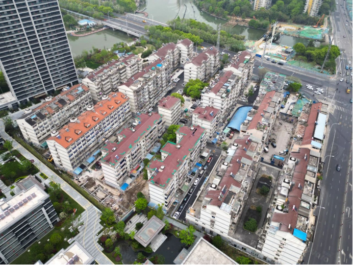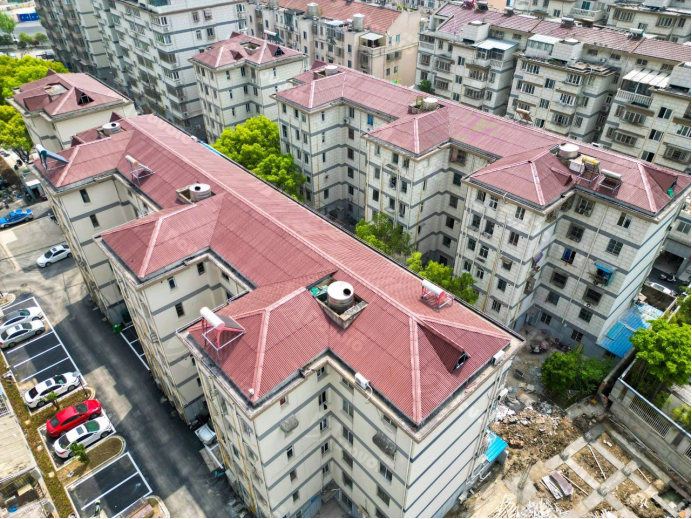 “月秀東園平改坡項目”位于無錫市濱湖區(qū),小區(qū)建成于1981年,其中部分樓棟的屋面為平屋面,部分屋面為坡屋面。對原先平頂屋面的樓棟進行坡屋面改造,采用幻景波形瀝青瓦施工,達到整體造型的統(tǒng)一,提升住戶居住舒適性。