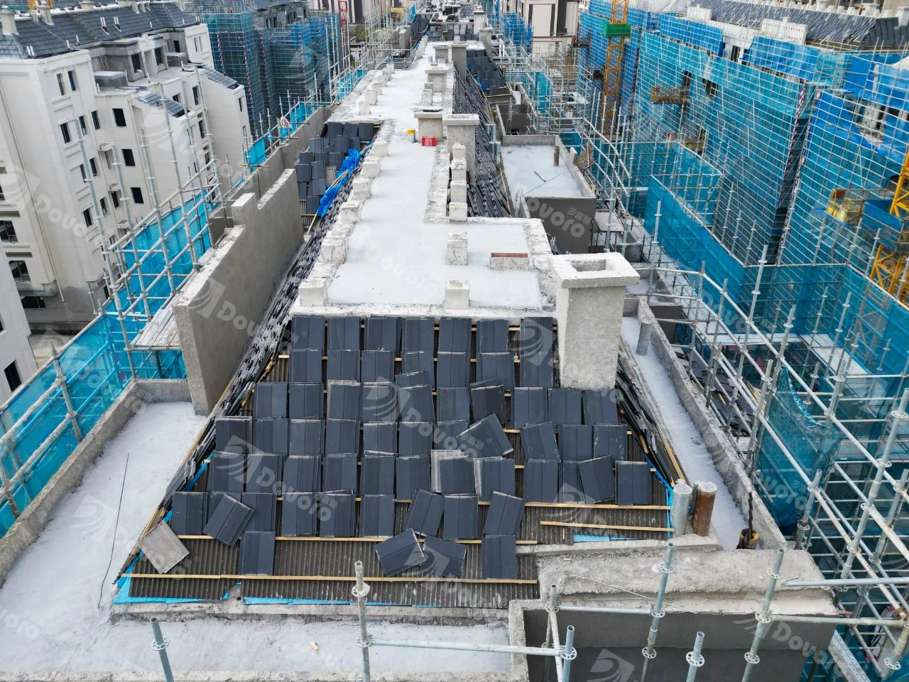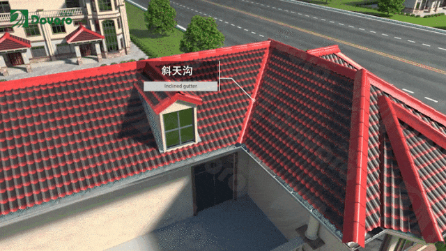 多富瑞精心設計了不同位置的節(jié)點處理方式,如屋脊、天溝、煙囪等位置,使用防水卷材或通風卷材輔助防水。無需像傳統(tǒng)坡屋面需要大量使用防水卷材,僅在部分位置加強防水性,使不同角度瓦材之間也可以嚴絲合縫。
