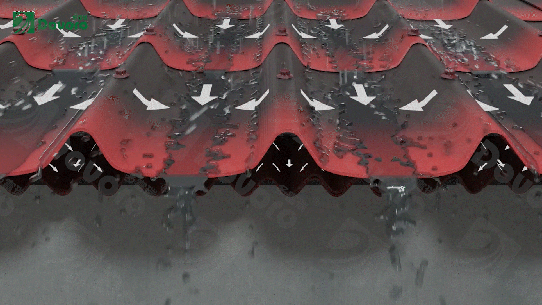 波形瀝青瓦的波形設計,當雨水接觸到屋面,會順著從波峰流到波谷,從上往下排出屋面。雨水無法附著在瓦材上,無法聚積,更不易往下滲漏,屋面自然不容易漏水。