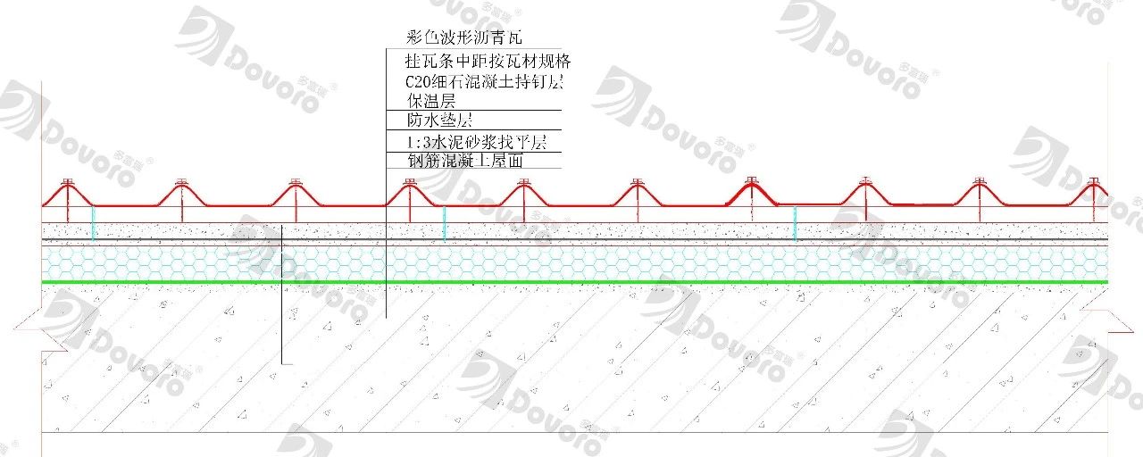 在項(xiàng)目的屋面改造設(shè)計(jì)中,屋面構(gòu)造由下而上依次為水泥基層、找平層、防水卷材、保溫層、持釘層、掛瓦條、幻彩波形瀝青瓦。波形瀝青瓦每平僅約3kg的重量,減輕老舊住宅屋面承重負(fù)擔(dān);屋面構(gòu)造間采用物理連接,大大提升施工效率,減少施工周期,降低屋面改造對(duì)居民生活的影響。