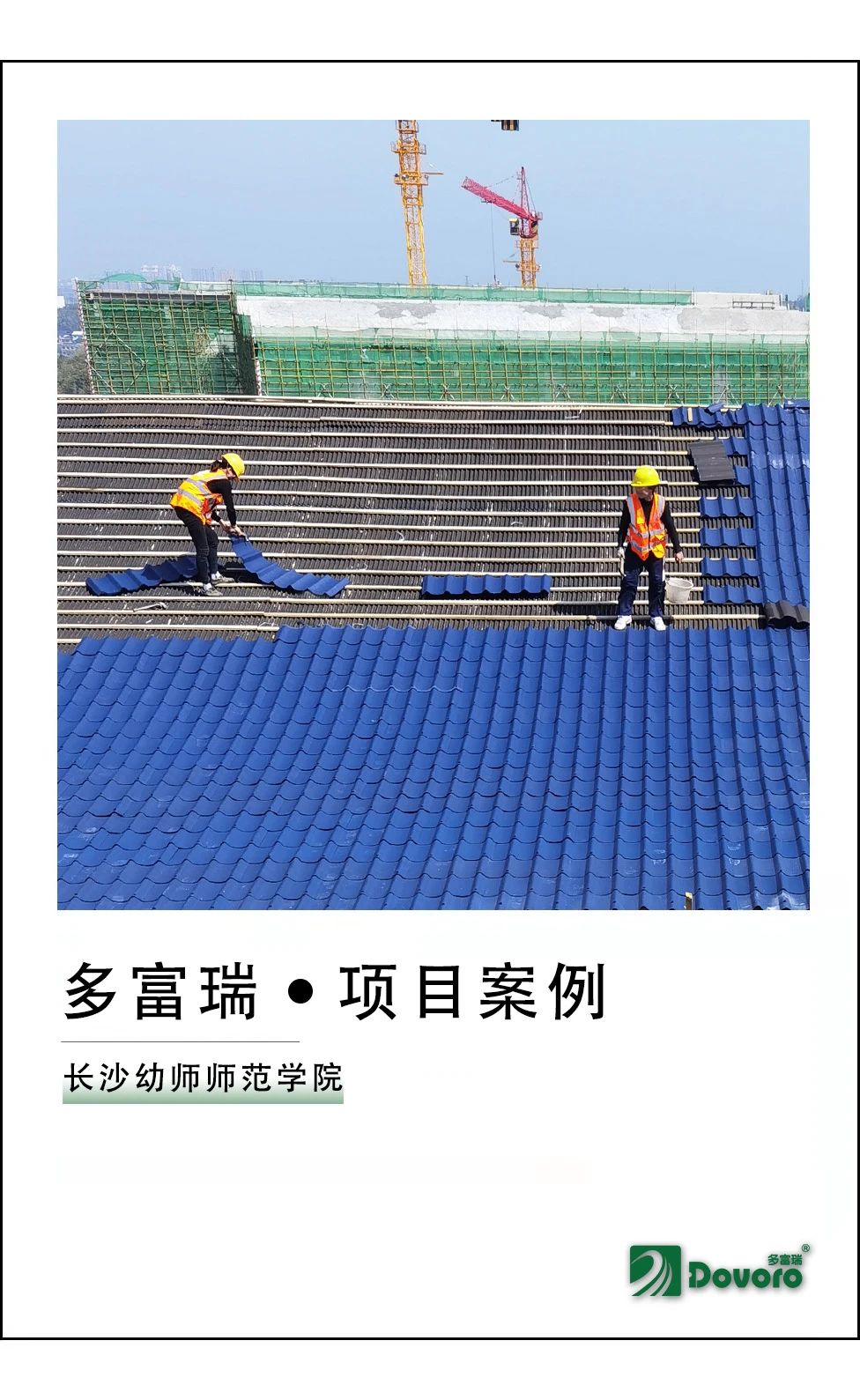 本項(xiàng)目為長(zhǎng)沙幼師高等專科學(xué)院,使用“幻彩”波形瀝青瓦和波形瀝青防水板組合施工,總施工面積約40000平米。