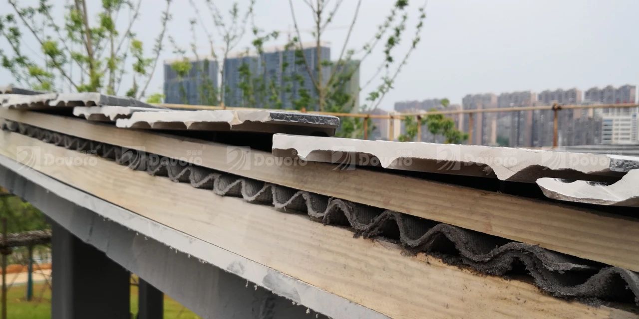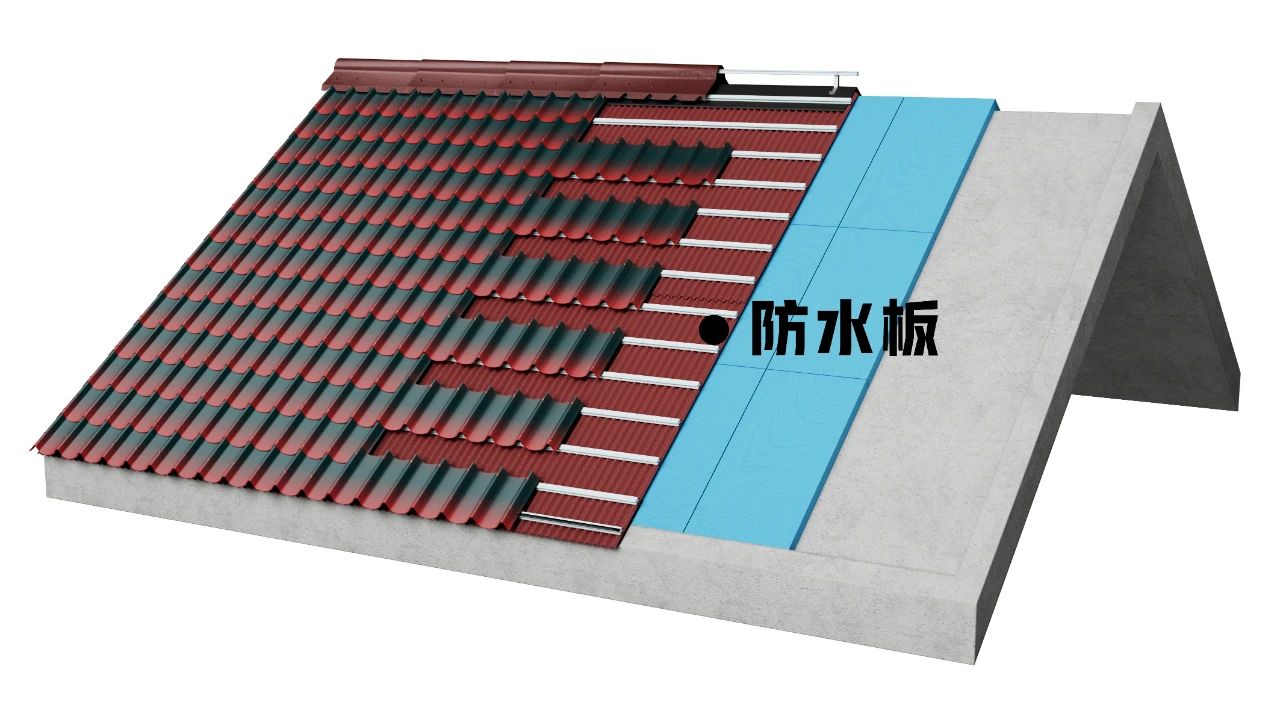 波形瀝青防水板采用了與波形瀝青瓦同樣的防排結(jié)合設(shè)計。遇到極端降雨天氣,一旦屋面瓦材發(fā)生滲漏,雨水也會順著波形瀝青防水板從上往下排出屋面,將屋面漏水的概率降至最低。