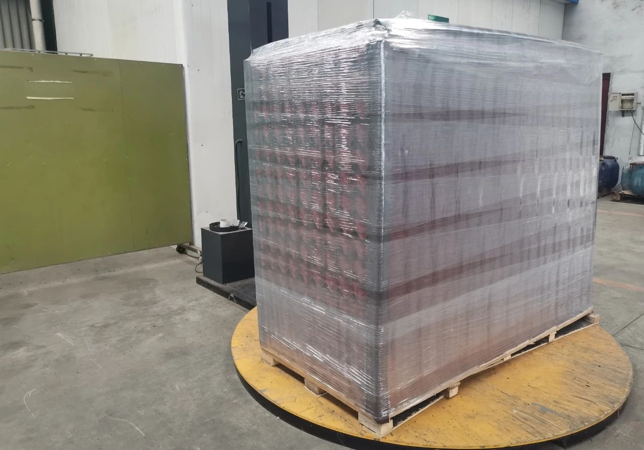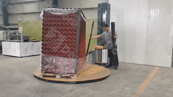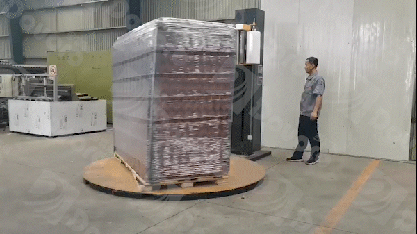進行完以上流程后,貨物在包裝機上完成包裝的最后步驟。使用具有韌性的包裝膜,對貨物的整體進行纏繞,固定住四個角落的護邊和上方的蓋帽。不僅使貨物更整體更穩(wěn)固,也將貨物密封在包裝之中,與周圍不確定環(huán)境隔離。