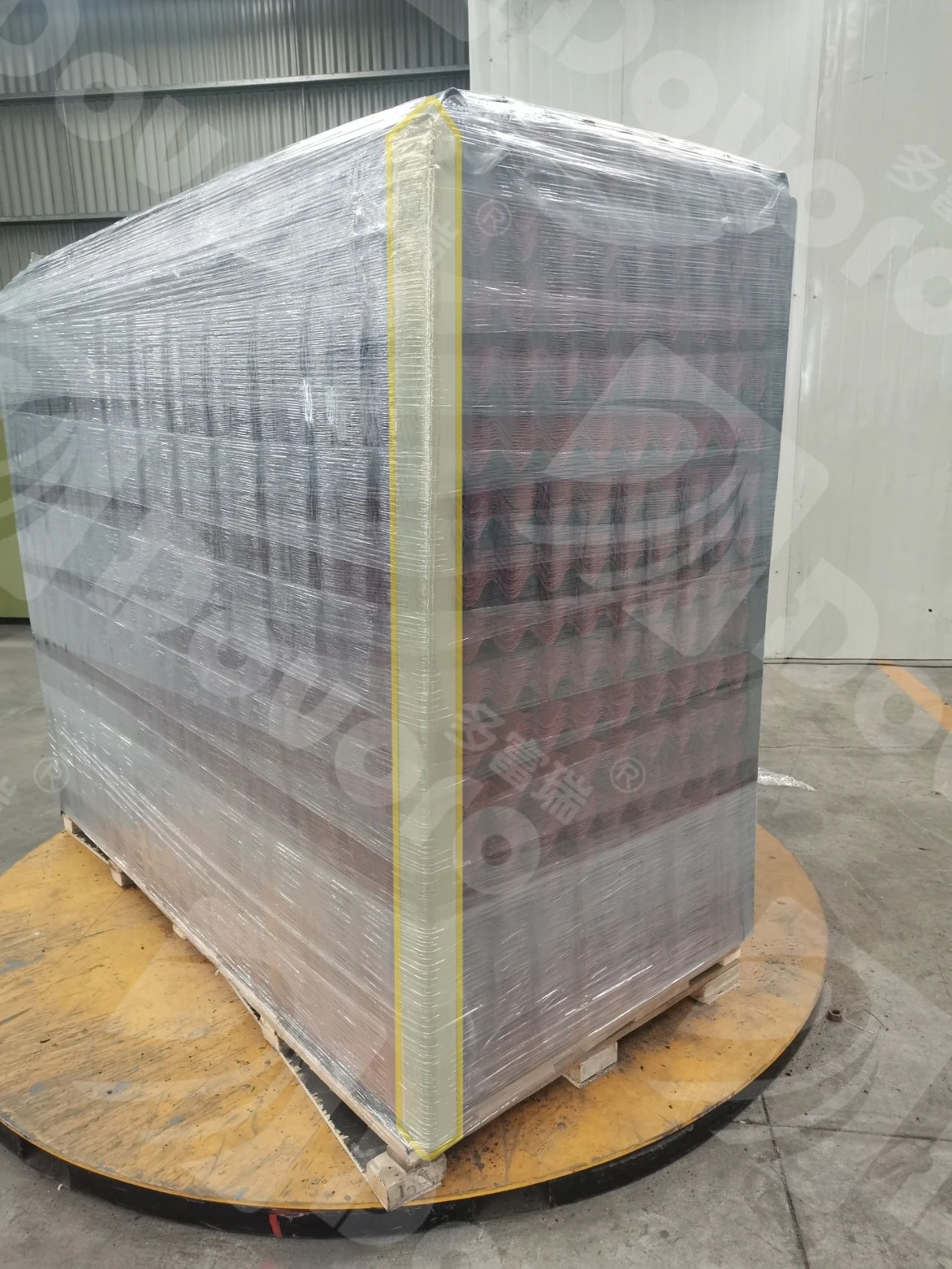 為了便于發(fā)貨前的檢查和到貨后的客戶驗收,多富瑞采取錯位碼垛的方式,錯位部分的投影面積在下方木板面積之內(nèi),波形瀝青防水板均采用6張一錯位的方式碼垛,彩色波形瀝青瓦均采用10張一錯位的方式碼垛。