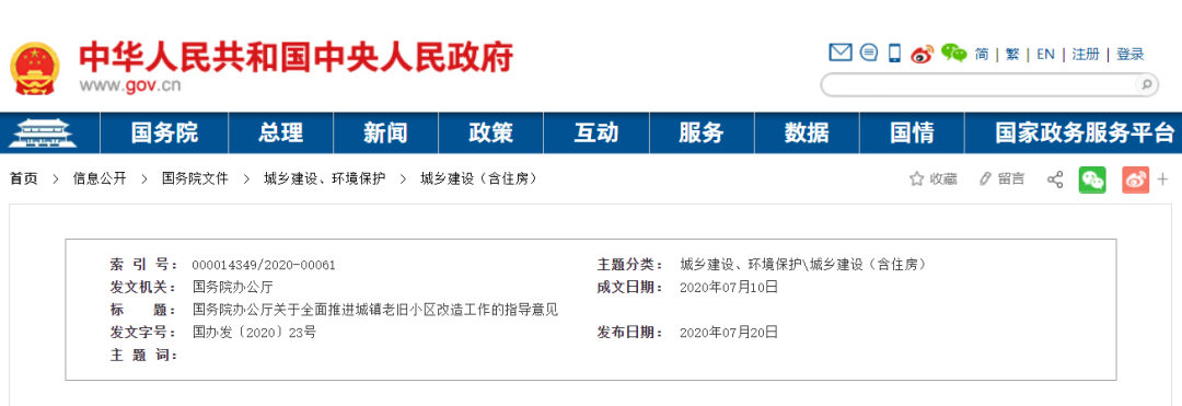 2020年7月20日國務(wù)院辦公廳發(fā)布《關(guān)于全面推進城鎮(zhèn)老舊小區(qū)改造工作的指導(dǎo)意見(國辦發(fā)〔2020〕23號)》,指導(dǎo)意見中指出城鎮(zhèn)老舊小區(qū)改造是重大民生工程和發(fā)展工程,對滿足人民群眾美好生活需要、推動惠民生擴內(nèi)需、推進城市更新和開發(fā)建設(shè)方式轉(zhuǎn)型、促進經(jīng)濟高質(zhì)量發(fā)展具有十分重要的意義。