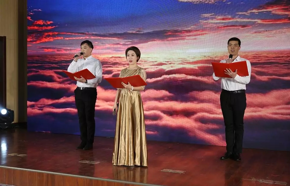 演出在歌伴舞《不忘初心》中拉開序幕,節(jié)目內(nèi)容豐富多彩、形式多樣,有情景劇、歌伴舞、小品、詩朗誦等,充分展示了集團員工良好的精神面貌。演員們個個精神飽滿,情緒高昂,以最好的狀態(tài)將節(jié)目奉獻給大家,贏得了觀眾陣陣掌聲。